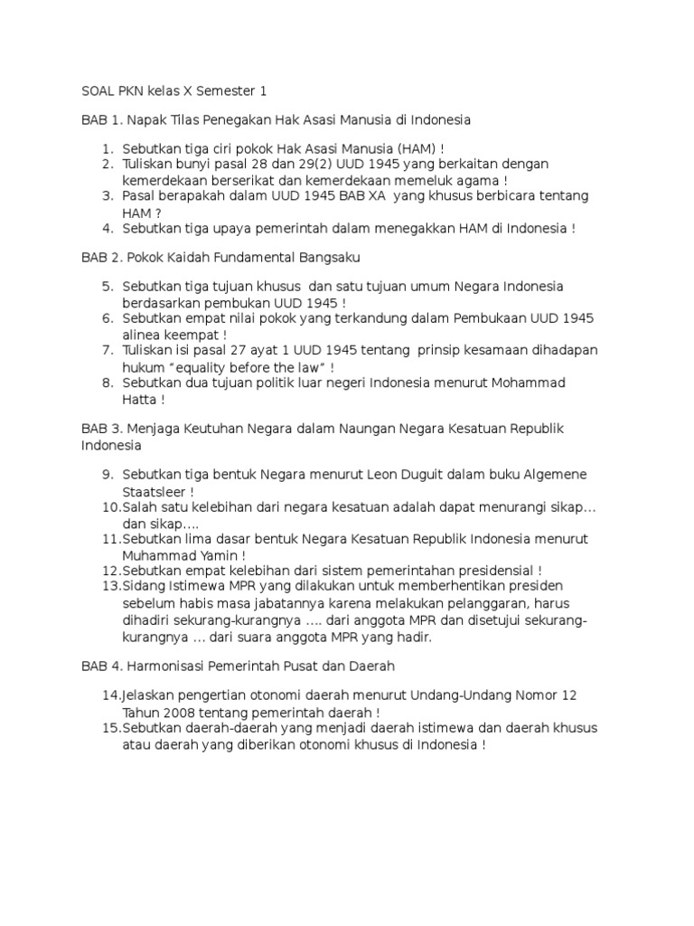 Kartu Soal Ppkn Uas Semester 1 Kelas X from data03.123doks.com Berikut contoh soal ujian sekolah atau us / uas / usbn ppkn (pkn) smp kurikulum 2013 tahun 2021 tahun pelajaran 2020/2021.desain soal latihan ini sebagai hasil pelatihan membuat soal online melalui blogspot. Soal pkn bab uud 1945. Batang tubuh dan penjelasan e. Soal pkn perihal dasar negara dan konstitusi beserta kunci jawabannya. Pada kali ini, kami akan membagikan latihan soal mata pelajaran ppkn smp/ mts dan sma/ smk tentang dasar negara dan konstitusi. Selain itu dalam hubungannya dengan hakikat dan kedudukan pembukaan uud 1945 sebagai pokok kaidah negara yang fubdamental, maka sebenarnya secara material yang merupakan esensi atau inti sari dari pokok kaidah negara fundamental tersebut tidak lain. Jawaban 1 c 2 d 3 c 4 a 5 e 6 e 7 d 8 d 9 d 10 e 11 e 12 d 13 c 14 e 15 e 16 e 17 e 18 c 19 d 20 d nah, demikian di atas contoh soal usbn pelajaran pendidikan kewarganegaraan atau pkn untuk siswa kelas 12 sma/ma/smk beserta kunci jawabannya. Pokok kaidah negara yang fundamental c.